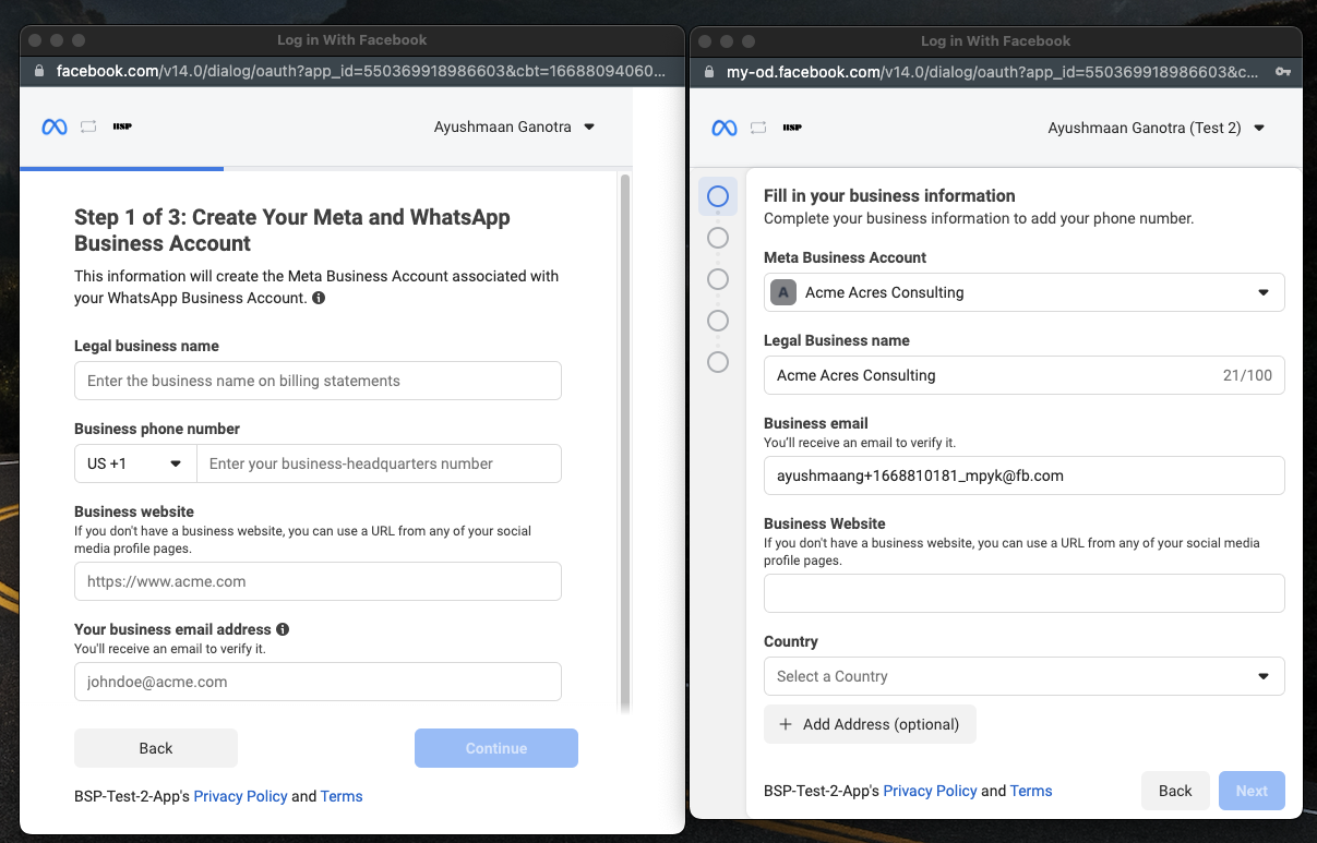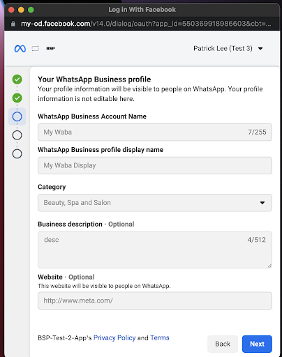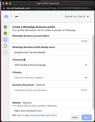 If the user elects to create a new WABA and profile, they will fill out all their WABA and profile information on a single page.