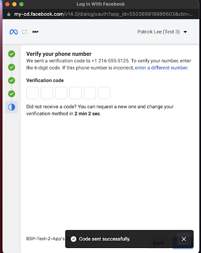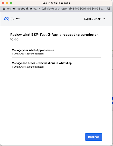 In the flow, businesses review the list of permissions requested by their Solution Partner, also known as Solution Partner. The permissions cannot be edited. Businesses must tap Continue to acknowledge the permissions and complete Embedded Signup.